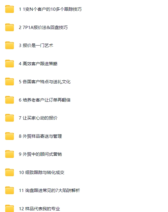 每个文件夹包含多个子文件,目录太多就不一一列举 声明: 1. 本站资源购于网络,仅供参考学习使用,版权归原作者所有。若侵犯到您的权益,请告知我们,我们将在24小时内下架处理。 2. 极少数课程可能因为课程包含相关敏感内容,造成百度网盘分享链接失效,如遇到课程下载链接失效等,请联系在线客服获取新下载链接。